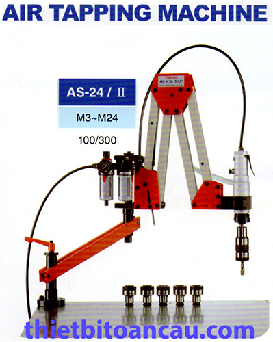 Máy ta rô cần AS-24-II làm việc với áp suất khí nén 6-8Kg/cm2, máy cho phép ta rô trên nhiều loại vật liệu khác nhau như thép trung bình, kim loại màu hợp kim, thép khuôn mẩu và Inox.